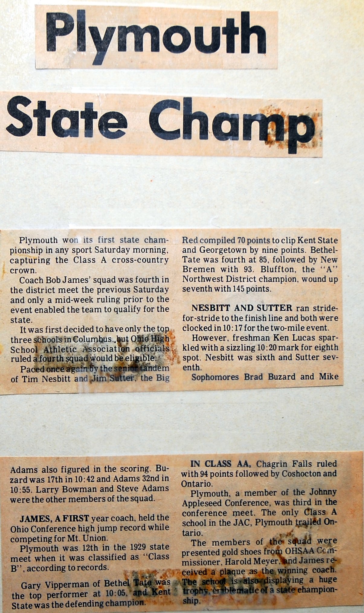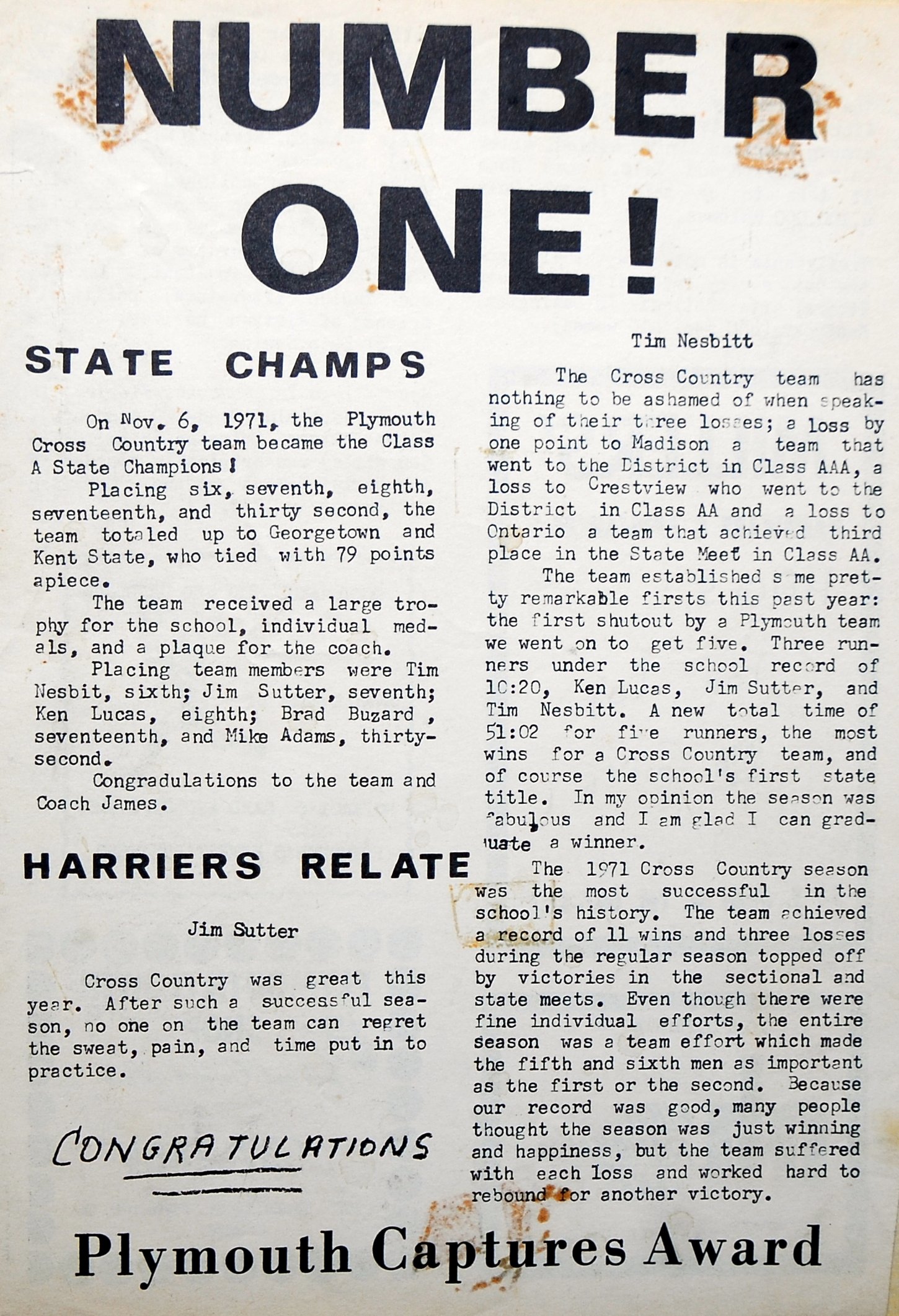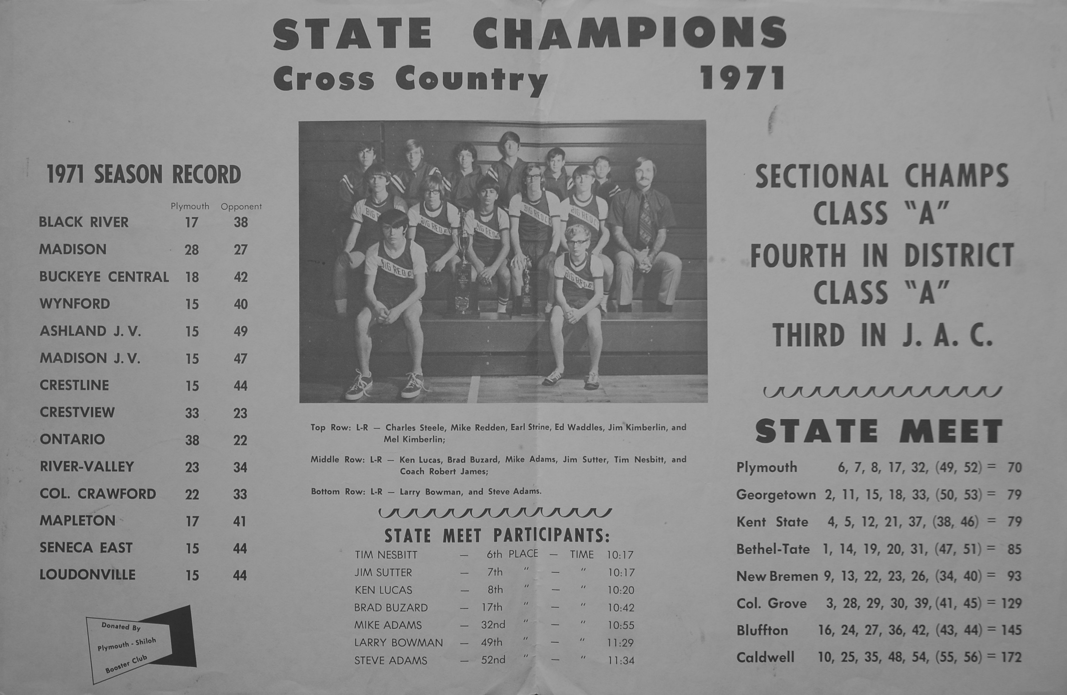 Scorekeeper: Barb Van Wagner Timekeeper: Karen Farnwalt Position Judge: Mary Jo Mack ___________________________________________________________________________________________________________ Meet Summaries 9/7/1971 - Dual at Black River High School Boys 1st Place Team Tim Nesbitt 11:01 1st Ken Lucas 11:14 2nd Jim Sutter 11:28 3rd Brad Buzard 11:46 5th Mika Adams 11:54 6th Mike Redden 15:11 12th Earl Strine 15:30 13th Charley Steele 15:36 14th ___________________________________________________________________________________________________________ 9/9/1971 - Dual at Madison High School Boys 2nd Place Team Tim Nesbitt 10:54 2nd Ken Lucas 11:02 3rd Jim Sutter 11:05 5th Brad Buzard 11:38 8th Mika Adams 11:52 10th Larry Bowman 13:05 14th Mike Redden 13:32 16th Charley Steele 14:45 22nd Earl Strine 14:57 23rd Ed Waddles 21:23 25th ___________________________________________________________________________________________________________ 9/14/1971 - Dual vs. Buckeye Central High School Boys 1st Place Team Tim Nesbitt 10:06 1st Ken Lucas 10:11 2nd Jim Sutter 10:38 4th Mike Adams 10:46 5th Brad Buzard 10:47 6th Larry Bowman 11:40 8th Steve Adams 11:53 10th Jim Kimberlin 12:09 11th Mike Redden 12:41 15th Earl Strine 12:42 16th Mel Kimberlin 13:06 17th Charley Steele 13:37 19th ___________________________________________________________________________________________________________ 9/16/1971 - Dual vs. Wynford High School Boys 1st Place Team Tim Nesbitt 10:07 1st Ken Lucas 10:09 2nd Jim Sutter 10:31 3rd Brad Buzard 10:37 4th Mike Adams 10:39 6th Larry Bowman 11:45 13th Steve Adams 11:50 15th Jim Kimberlin 12:01 17th Mel Kimberlin 12:05 19th Earl Strine 12:24 20th Mike Redden 12:34 21st Charley Steele 12:54 24th Ed Waddles 16:38 26th ___________________________________________________________________________________________________________ 9/21/1971 - Tri at Ashland with Madison High School Boys 1st Place Team Tim Nesbitt 10:41 1st Ken Lucas 10:42 2nd Jim Sutter 11:19 3rd Mike Adams 11:21 4th Brad Buzard 11:26 5th Larry Bowman 11:56 7th Steve Adams 12:11 10th Jim Kimberlin 12:26 13th Mike Redden 12:53 17th Earl Strine 13:01 18th Mel Kimberlin 13:04 19th Charley Steele 13:37 24th Ed Waddles 19:06 29th ___________________________________________________________________________________________________________ 9/23/1971 - Dual vs. Crestline High School Boys 1st Place Team Tim Nesbitt 10:06 1st Ken Lucas 10:08 2nd Jim Sutter 10:36 3rd Brad Buzard 10:43 4th Mike Adams 10:46 5th Larry Bowman 11:33 9th Steve Adams 11:34 10th Mike Redden 12:00 13th Jim Kimberlin 12:00 14th Earl Strine 12:28 15th Charley Steele 12:33 16th Mel Kimberlin 13:08 17th Ed Waddles 16:55 19th ___________________________________________________________________________________________________________ 9/30/1971 - Tri at Ontario with River Valley High School Boys 2nd Place Team Tim Nesbitt 10:12 2nd Ken Lucas 10:21 4th Jim Sutter 10:41 11th Brad Buzard 10:51 14th Mike Adams 10:58 17th Larry Bowman 11:37 18th Steve Adams 12:12 30th Earl Strine 12:35 31st Mike Redden 12:39 32nd Jim Kimberlin 12:49 33rd Charley Steele 13:19 34th Mel Kimberlin 13:29 35th Ed Waddles 17:27 36th ___________________________________________________________________________________________________________ 10/5/1971 - Dual vs. Colonel Crawford High School Boys 1st Place Team Tim Nesbitt 9:59 1st Ken Lucas 10:05 3rd Jim Sutter 10:25 4th Brad Buzard 10:29 5th Mike Adams 10:46 9th Larry Bowman 11:15 12th Steve Adams 11:31 14th Mike Redden 11:50 18th Jim Kimberlin 11:56 20th Earl Strine 12:10 22nd Mel Kimberlin 12:15 23rd Charley Steele 13:11 26th ___________________________________________________________________________________________________________ 10/12/1971 - Dual at Mapleton High School Boys 1st Place Team Tim Nesbitt 10:11 1st Ken Lucas 10:15 2nd Jim Sutter 10:34 3rd Brad Buzard 10:41 5th Mika Adams 10:44 6th Larry Bowman 11:15 9th Steve Adams 11:30 11th Mike Redden 11:39 12th Earl Strine 12:03 13th Mel Kimberlin 12:04 14th Jim Kimberlin 12:26 16th ___________________________________________________________________________________________________________ 10/14/1971 - Dual vs. Seneca East High School Boys 1st Place Team Tim Nesbitt 10:00 1st Ken Lucas 10:08 2nd Jim Sutter 10:19 3rd Brad Buzard 10:33 4th Mike Adams 10:35 5th Larry Bowman 11:10 9th Steve Adams 11:12 10th Mike Redden 11:35 12th Jim Kimberlin 11:36 13th Earl Strine 11:51 15th Mel Kimberlin 11:54 16th ___________________________________________________________________________________________________________ 10/19/1971 - Johnny Appleseed Conference Championship at Possum Run High School Boys 3rd Place Team Jim Sutter 10:29 3rd Tim Nesbitt 10:42 10th Ken Lucas 10:56 16th Mike Adams 11:06 21st Brad Buzard 11:07 22nd Larry Bowman 11:29 33rd Steve Adams 11:54 38th ___________________________________________________________________________________________________________ 10/23/1971 - Sectional Championship at Tiffin Hedges Boyer Park High School Boys 1st Place Team Tim Nesbitt 10:27 2nd Jim Sutter 10:28 3rd Ken Lucas 10:42 6th Brad Buzard 11:03 10th Mike Adams 11:06 11th Larry Boamwn 11:25 24th Steve Adams 12:00 49th ___________________________________________________________________________________________________________ 10/26/1971 - Dual vs. Loudonville High School Boys 1st Place Team Tim Nesbitt 10:00 1st Ken Lucas 10:10 2nd Jim Sutter 10:13 3rd Brad Buzard 10:36 4th Mike Adams 10:37 5th Larry Boamwn 11:15 8th Steve Adams 11:34 11th Jim Kimberlin 11:37 12th Mel Kimberlin 11:48 14th Mike Redden 11:56 15th Earl Strine 12:14 16th ___________________________________________________________________________________________________________ 10/30/1971 - District Championship at Kildaire Country Club High School Boys 4th Place Team Tim Nesbitt 10:00 7th Jim Sutter 10:01 8th Ken Lucas 10:07 12th Mike Adams 10:52 53rd Brad Buzard 10:53 54th Larry Bowman 12:39 92nd Steve Adams 13:00 113th ___________________
