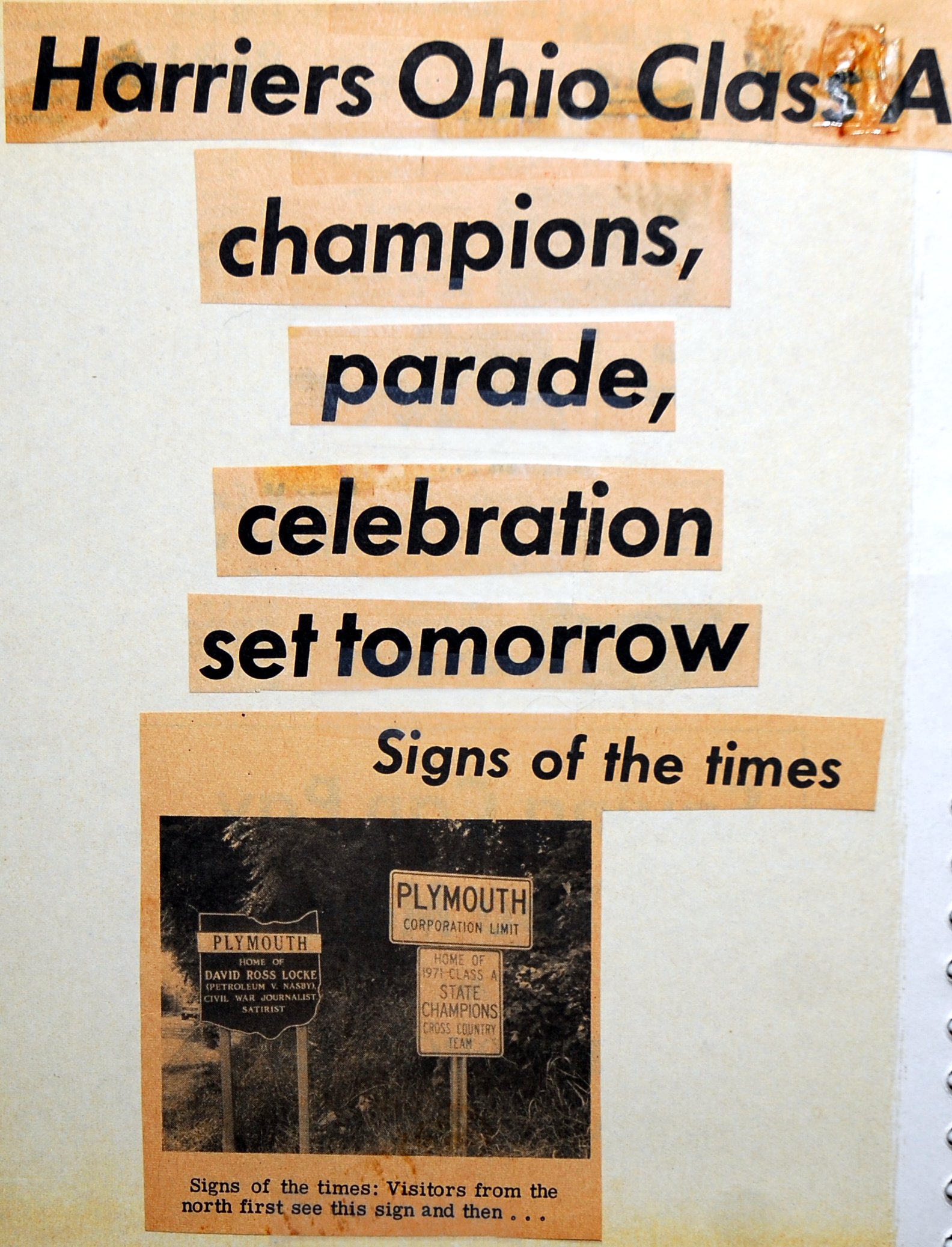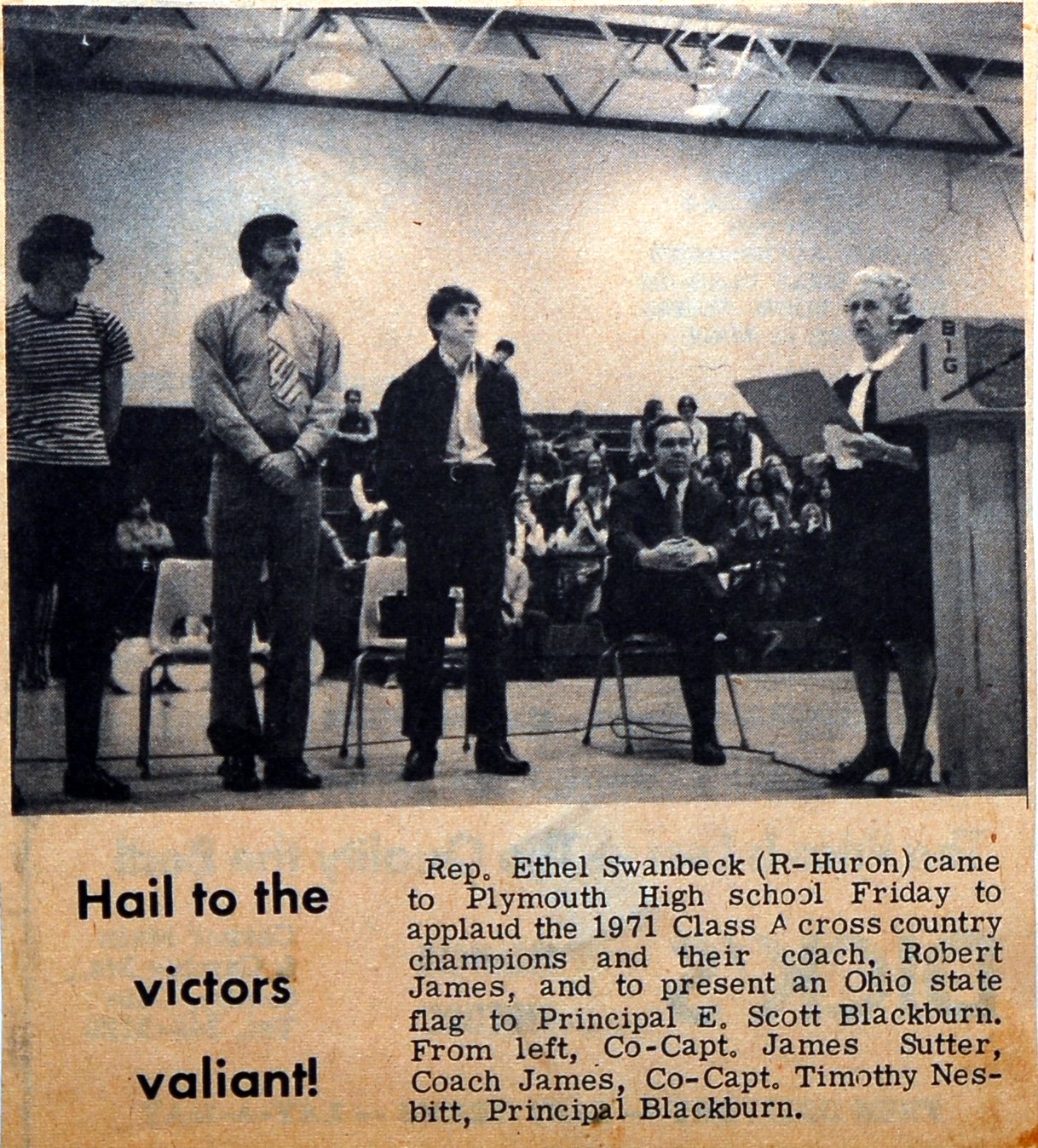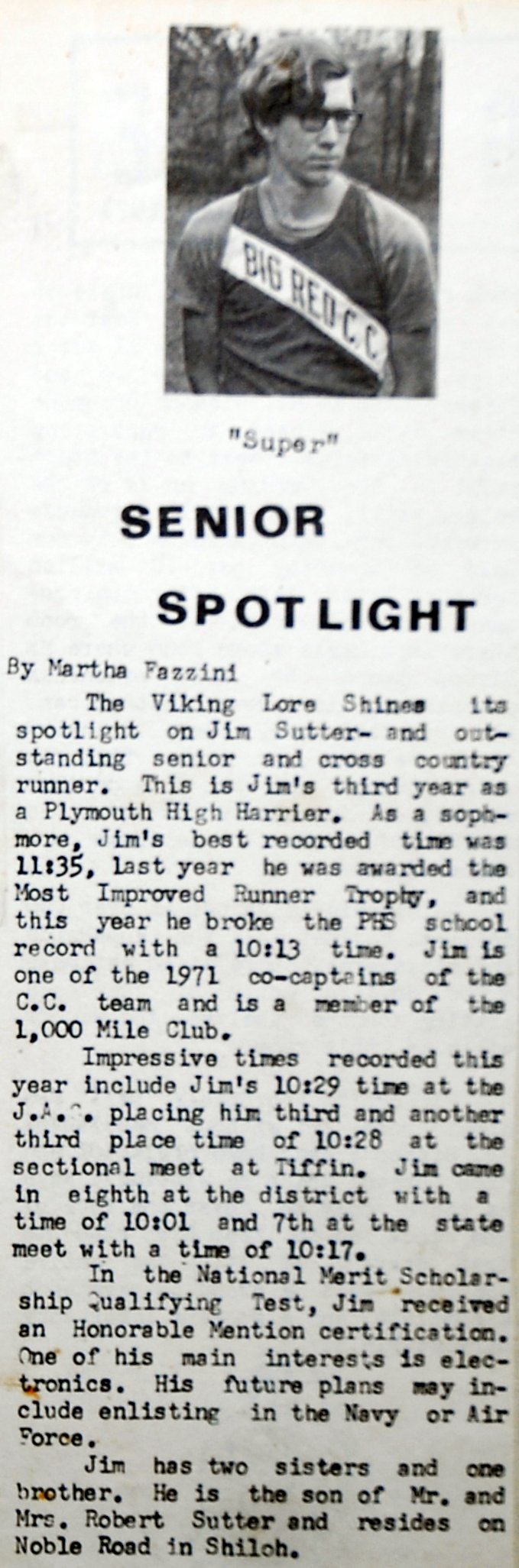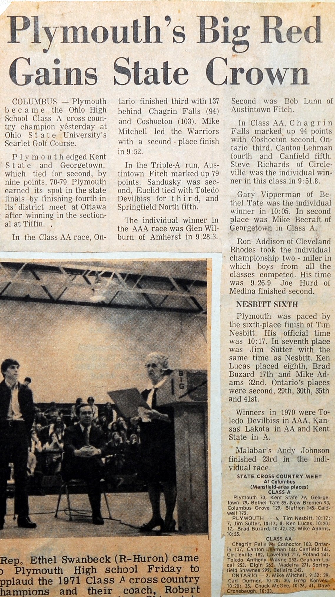 Scorekeeper: Barb Van Wagner Timekeeper: Karen Farnwalt Position Judge: Mary Jo Mack ___________________________________________________________________________________________________________ Meet Summaries 9/7/1971 - Dual at Black River High School Boys 1st Place Team Tim Nesbitt 11:01 1st Ken Lucas 11:14 2nd Jim Sutter 11:28 3rd Brad Buzard 11:46 5th Mika Adams 11:54 6th Mike Redden 15:11 12th Earl Strine 15:30 13th Charley Steele 15:36 14th ___________________________________________________________________________________________________________ 9/9/1971 - Dual at Madison High School Boys 2nd Place Team Tim Nesbitt 10:54 2nd Ken Lucas 11:02 3rd Jim Sutter 11:05 5th Brad Buzard 11:38 8th Mika Adams 11:52 10th Larry Bowman 13:05 14th Mike Redden 13:32 16th Charley Steele 14:45 22nd Earl Strine 14:57 23rd Ed Waddles 21:23 25th ___________________________________________________________________________________________________________ 9/14/1971 - Dual vs. Buckeye Central High School Boys 1st Place Team Tim Nesbitt 10:06 1st Ken Lucas 10:11 2nd Jim Sutter 10:38 4th Mike Adams 10:46 5th Brad Buzard 10:47 6th Larry Bowman 11:40 8th Steve Adams 11:53 10th Jim Kimberlin 12:09 11th Mike Redden 12:41 15th Earl Strine 12:42 16th Mel Kimberlin 13:06 17th Charley Steele 13:37 19th ___________________________________________________________________________________________________________ 9/16/1971 - Dual vs. Wynford High School Boys 1st Place Team Tim Nesbitt 10:07 1st Ken Lucas 10:09 2nd Jim Sutter 10:31 3rd Brad Buzard 10:37 4th Mike Adams 10:39 6th Larry Bowman 11:45 13th Steve Adams 11:50 15th Jim Kimberlin 12:01 17th Mel Kimberlin 12:05 19th Earl Strine 12:24 20th Mike Redden 12:34 21st Charley Steele 12:54 24th Ed Waddles 16:38 26th ___________________________________________________________________________________________________________ 9/21/1971 - Tri at Ashland with Madison High School Boys 1st Place Team Tim Nesbitt 10:41 1st Ken Lucas 10:42 2nd Jim Sutter 11:19 3rd Mike Adams 11:21 4th Brad Buzard 11:26 5th Larry Bowman 11:56 7th Steve Adams 12:11 10th Jim Kimberlin 12:26 13th Mike Redden 12:53 17th Earl Strine 13:01 18th Mel Kimberlin 13:04 19th Charley Steele 13:37 24th Ed Waddles 19:06 29th ___________________________________________________________________________________________________________ 9/23/1971 - Dual vs. Crestline High School Boys 1st Place Team Tim Nesbitt 10:06 1st Ken Lucas 10:08 2nd Jim Sutter 10:36 3rd Brad Buzard 10:43 4th Mike Adams 10:46 5th Larry Bowman 11:33 9th Steve Adams 11:34 10th Mike Redden 12:00 13th Jim Kimberlin 12:00 14th Earl Strine 12:28 15th Charley Steele 12:33 16th Mel Kimberlin 13:08 17th Ed Waddles 16:55 19th ___________________________________________________________________________________________________________ 9/30/1971 - Tri at Ontario with River Valley High School Boys 2nd Place Team Tim Nesbitt 10:12 2nd Ken Lucas 10:21 4th Jim Sutter 10:41 11th Brad Buzard 10:51 14th Mike Adams 10:58 17th Larry Bowman 11:37 18th Steve Adams 12:12 30th Earl Strine 12:35 31st Mike Redden 12:39 32nd Jim Kimberlin 12:49 33rd Charley Steele 13:19 34th Mel Kimberlin 13:29 35th Ed Waddles 17:27 36th ___________________________________________________________________________________________________________ 10/5/1971 - Dual vs. Colonel Crawford High School Boys 1st Place Team Tim Nesbitt 9:59 1st Ken Lucas 10:05 3rd Jim Sutter 10:25 4th Brad Buzard 10:29 5th Mike Adams 10:46 9th Larry Bowman 11:15 12th Steve Adams 11:31 14th Mike Redden 11:50 18th Jim Kimberlin 11:56 20th Earl Strine 12:10 22nd Mel Kimberlin 12:15 23rd Charley Steele 13:11 26th ___________________________________________________________________________________________________________ 10/12/1971 - Dual at Mapleton High School Boys 1st Place Team Tim Nesbitt 10:11 1st Ken Lucas 10:15 2nd Jim Sutter 10:34 3rd Brad Buzard 10:41 5th Mika Adams 10:44 6th Larry Bowman 11:15 9th Steve Adams 11:30 11th Mike Redden 11:39 12th Earl Strine 12:03 13th Mel Kimberlin 12:04 14th Jim Kimberlin 12:26 16th ___________________________________________________________________________________________________________ 10/14/1971 - Dual vs. Seneca East High School Boys 1st Place Team Tim Nesbitt 10:00 1st Ken Lucas 10:08 2nd Jim Sutter 10:19 3rd Brad Buzard 10:33 4th Mike Adams 10:35 5th Larry Bowman 11:10 9th Steve Adams 11:12 10th Mike Redden 11:35 12th Jim Kimberlin 11:36 13th Earl Strine 11:51 15th Mel Kimberlin 11:54 16th ___________________________________________________________________________________________________________ 10/19/1971 - Johnny Appleseed Conference Championship at Possum Run High School Boys 3rd Place Team Jim Sutter 10:29 3rd Tim Nesbitt 10:42 10th Ken Lucas 10:56 16th Mike Adams 11:06 21st Brad Buzard 11:07 22nd Larry Bowman 11:29 33rd Steve Adams 11:54 38th ___________________________________________________________________________________________________________ 10/23/1971 - Sectional Championship at Tiffin Hedges Boyer Park High School Boys 1st Place Team Tim Nesbitt 10:27 2nd Jim Sutter 10:28 3rd Ken Lucas 10:42 6th Brad Buzard 11:03 10th Mike Adams 11:06 11th Larry Boamwn 11:25 24th Steve Adams 12:00 49th ___________________________________________________________________________________________________________ 10/26/1971 - Dual vs. Loudonville High School Boys 1st Place Team Tim Nesbitt 10:00 1st Ken Lucas 10:10 2nd Jim Sutter 10:13 3rd Brad Buzard 10:36 4th Mike Adams 10:37 5th Larry Boamwn 11:15 8th Steve Adams 11:34 11th Jim Kimberlin 11:37 12th Mel Kimberlin 11:48 14th Mike Redden 11:56 15th Earl Strine 12:14 16th ___________________________________________________________________________________________________________ 10/30/1971 - District Championship at Kildaire Country Club High School Boys 4th Place Team Tim Nesbitt 10:00 7th Jim Sutter 10:01 8th Ken Lucas 10:07 12th Mike Adams 10:52 53rd Brad Buzard 10:53 54th Larry Bowman 12:39 92nd Steve Adams 13:00 113th ___________________