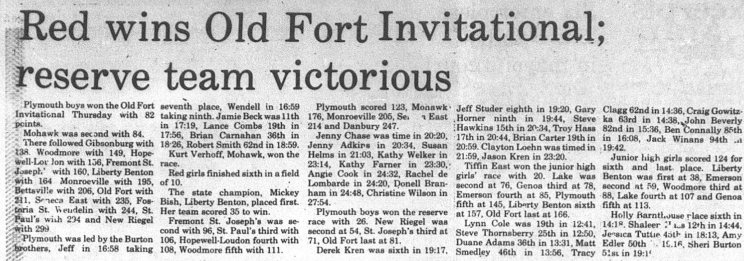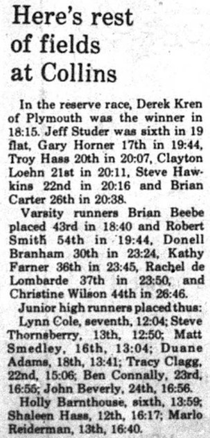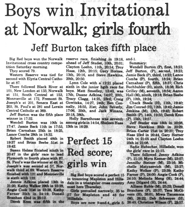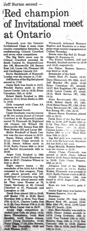 ___________________________________________________________________________________________________________ Middle School Boys Roster Name Year Season Best Duane Adams Eighth 13:31 Tracy Clagg Eighth 14:25 Lynn Cole Eighth 12:04 Ben Connelly Eighth 16:08 Craig Gowitzka Eighth 14:27 Matt Smedley Eighth 13:04 Steve Thornsberry Eighth 12:50 Tom Tackett Eighth 16:51 Jack Winans Eighth 19:33.5 John Beverly Seventh 15:36 ___________________________________________________________________________________________________________ Middle School Girls Roster Name Year Season Best Sheri Burton Eighth 19:19 Holly Barnthouse Seventh 13:59 Amy Edler Seventh 19:16 Shaelene Hass Seventh 14:44 Marlo Reidermen Seventh 16:40 Jessica Tuttle Seventh 18:13 ___________________________________________________________________________________________________________ Meet Summaries 8/26/1986 - Quad vs. Black River, Crestview, and Mapleton High School Boys 3rd Place Team Jeff Burton 18:09 3rd Wendell Burton 18:26 4th Jamie Beck 18:35 5th Bryan Carnahan 19:32 12th Derek Kren 20:53 26th Jeff Studer 21:04 30th Gary Horner 22:31 36th Clayton Loehn 22:49 38th Steve Hawkins 22:57 39th Brian Carter 24:49 44th Troy Hass 24:50 45th High School Girls 1st Place Team Jenny Adkins 21:41 1st Susan Helms 22:22 2nd Jenny Chase 22:41 3rd Kathy Welker 25:08 10th Kathy Farner 26:29 12th Angie Cook 26:29 13th Donell Branham 29:18 18th Christine Wilson 31:32 19th Rachel DeLombard 31:32 20th ___________________________________________________________________________________________________________ 8/28/1986 - Tri vs. Crestview and Northmor High School Boys 2nd Place Team Jeff Burton 17:36 1st Wendell Burton 17:57 3rd Jamie Beck 18:27 5th Bryan Carnahan 19:20 11th Brian Beebe 20:06 15th Derek Kren 20:15 16th Jeff Studer 20:18 17th Gary Horner 21:34 22nd Clayton Loehn 22:23 23rd Steve Hawkins 22:47 24th Brian Carter 23:00 25th Troy Hass 26:17 26th High School Girls 1st Place Team Jenny Adkins 21:31 1st Jenny Chase 21:54 2nd Susan Helms 22:11 3rd Kathy Farner 24:29 4th Kathy Welker 24:53 6th Rachel DeLombard 26:23 9th Angie Cook 27:24 11th Donell Branham 27:41 12th ___________________________________________________________________________________________________________ 9/5/1986 - Tri at St. Paul with South Central High School Boys 1st Place Team Jamie Beck 17:52 1st Wendell Burton 18:07 2nd Jeff Burton 18:08 3rd Bryan Carnahan 19:15 6th Derek Kren 20:17 10th Brian Beebe 20:30 13th Jeff Studer 20:35 14th Gary Horner 21:06 16th Robert Smith 21:10 17th Clayton Loehn 21:45 18th Steve Hawkins 22:05 19th Brian Carter 22:43 22nd Troy Hass 23:12 24th High School Girls 2nd Place Team Jenny Adkins 21:47 4th Jenny Chase 21:47 5th Susan Helms 22:51 8th Kathy Welker 24:07 13th Kathy Farner 25:35 16th Rachel DeLombard 26:11 18th Donell Branham 27:42 19th Christine Wilson 32:18 20th ___________________________________________________________________________________________________________ 9/9/1986 - Dual at New London High School Boys 2nd Place Team Jamie Beck 17:49 4th Jeff Burton 17:52 5th Wendell Burton 18:39 8th Bryan Carnahan 19:18 9th Robert Smith 19:42 10th Lance Combs 19:44 11th Brian Beebe 20:22 15th Derek Kren 20:41 17th Jeff Studer 20:47 18th Gary Horner 21:26 20th Brian Carter 22:00 21st Steve Hawkins 22:09 22nd Clayton Loehn 23:03 25th Troy Hass 23:18 26th High School Girls 1st Place Team Jenny Adkins 21:32 2nd Jenny Chase 22:08 3rd Susan Helms 22:33 4th Donell Branham 25:52 6th Angie Cook 25:53 7th Rachel DeLombard 26:39 8th Christine Wilson 30:50 10th ___________________________________________________________________________________________________________ 9/13/1986 - Tiffin Carnival High School Boys 8th Place Team Jamie Beck 18:01 23rd Jeff Burton 18:02 24th Wendell Burton 18:05 26th Bryan Carnahan 19:25 79th Lance Combs 19:27 27th - Open Race Robert Smith 19:32 89th Brian Beebe 19:46 99th Jeff Studer 20:09 55th - Open Race Derek Kren 20:34 134th Gary Horner 20:46 77th - Open Race Steve Hawkins 21:10 101st - Open Race Clayton Loehn 21:18 111th - Open Race Brian Carter 21:42 133rd - Open Race Troy Hass 22:23 164th - Open Race High School Girls 5th Place Team Jenny Adkins 21:39 12th Jenny Chase 21:44 13th Susan Helms 21:45 14th Kathy Welker 24:46 46th Donell Branham 25:47 54th Angie Cook 26:30 61st Christine Wilson 28:10 65th Middle School Boys 18th Place Team Lynn Cole 13:27.2 56th Steve Thornsberry 13:59.0 93rd Duane Adams 14:15.8 109th Matt Smedley 14:47.6 149th Craig Gowtizka 15:33.6 198th Tracy Clagg 15:36.3 201st Ben Connelly 17:38.8 246th Tom Tackett 18:14.1 252nd Jack Winans 19:33.5 259th Middle School Boys 17th Place Team Holly Barnthouse 14:52.8 27th Shaelene Hass 16:55.4 94th Marlo Reiderman 18:03.1 135th Amy Edler 20:21.8 194th Sheri Burton 21:38.3 203rd ___________________________________________________________________________________________________________ 9/16/1986 - Dual vs. Mansfield St. Peter's High School Boys 1st Place Team Jeff Burton 17:28 2nd Wendell Burton 17:46 3rd Jamie Beck 17:54 4th Bryan Carnahan 18:39 6th Lance Combs 19:10 10th Derek Kren 19:18 11th Gary Horner 19:45 13th Jeff Studer 19:48 14th Robert Smith 19:52 15th Steve Hawkins 21:06 17th Brian Carter 21:21 18th Troy Hass 21:29 19th Clayton Loehn 21:36 20th High School Girls 1st Place Team Jenny Chase 21:10 1st Jenny Adkins 21:11 2nd Susan Helms 23:34 5th Kathy Welker 23:38 6th Donell Branham 24:46 7th Angie Cook 25:05 8th Kathy Farner 26:52 9th Christine Wilson 29:50 10th ___________________________________________________________________________________________________________ 9/18/1986 - Old Fort Invitational High School Boys 1st Place Team/Reserves - 1st Jeff Burton 16:58 7th Wendell Burton 16:59 9th Jamie Beck 17:19 11th Lance Combs 17:51 19th Bryan Carnahan 18:26 36th Robert Smith 18:59 62nd Derek Kren 19:17 6th - Reserve Race Jeff Studer 19:20 8th - Reserve Race Gary Horner 19:44 9th - Reserve Race Steve Hawkins 20:34 15th - Reserve Race Troy Has